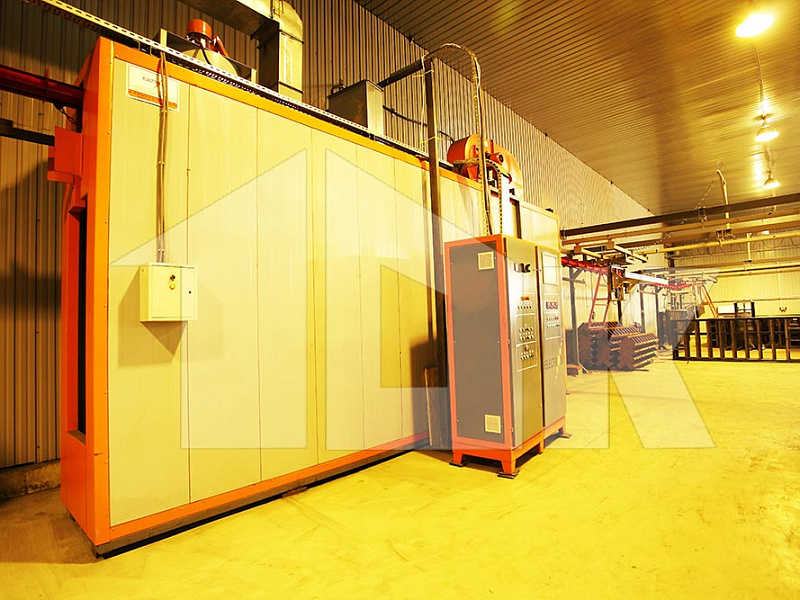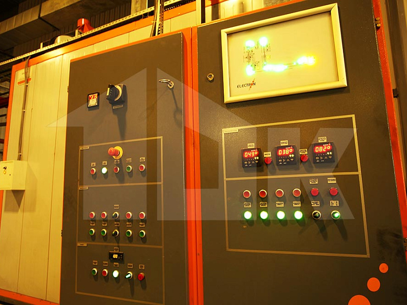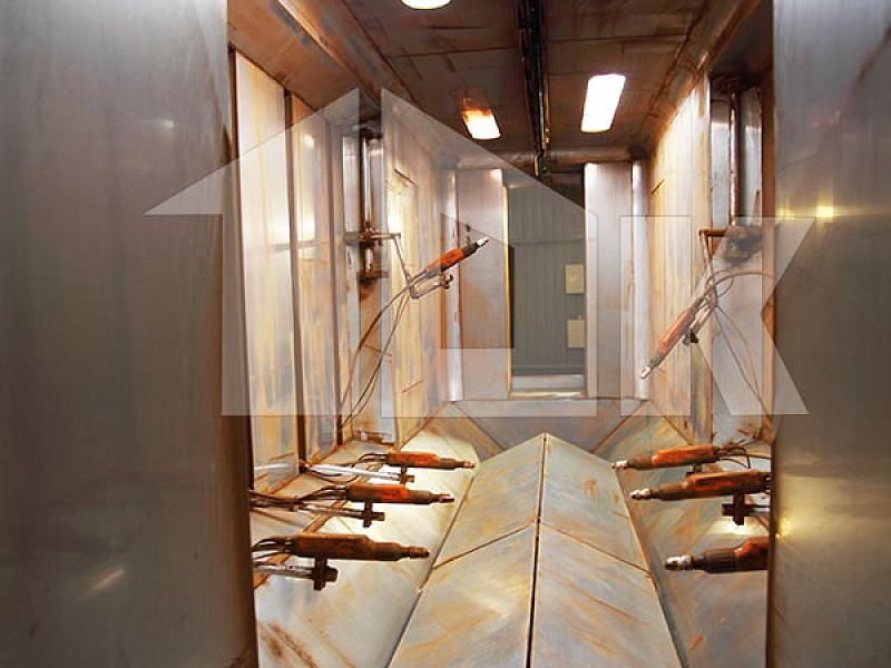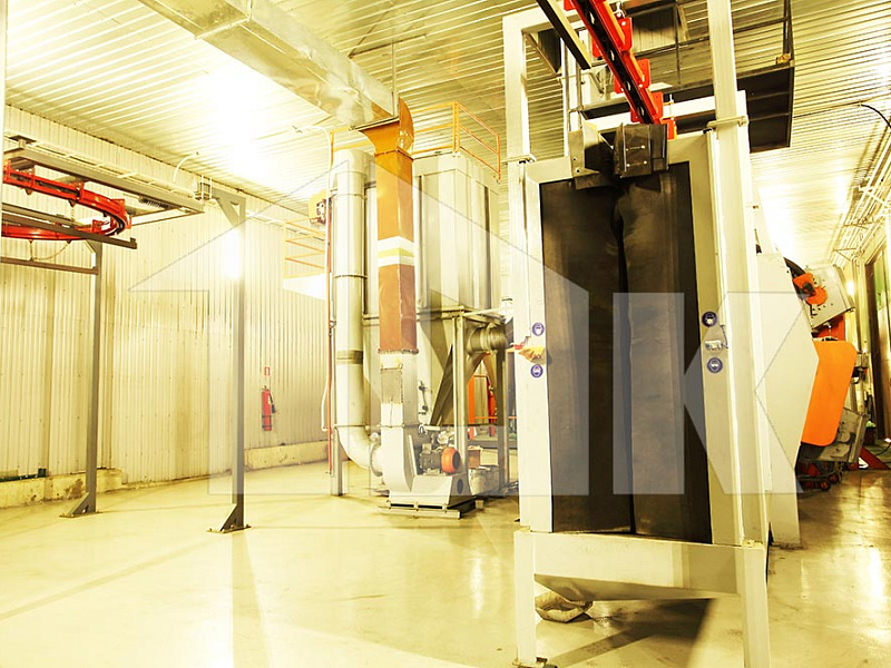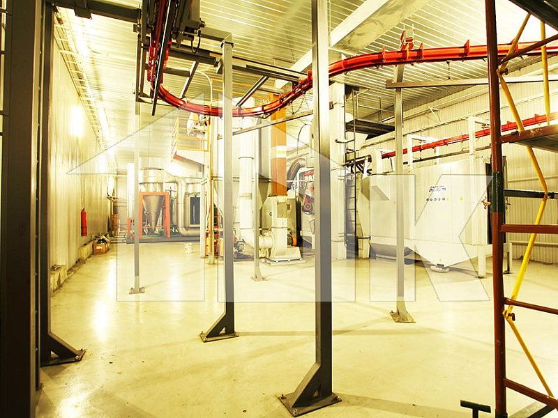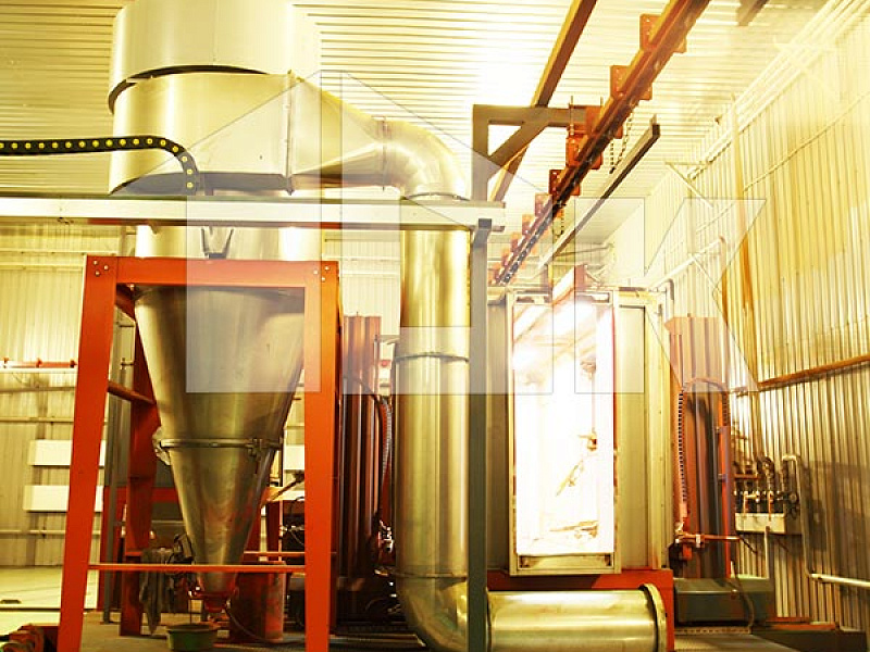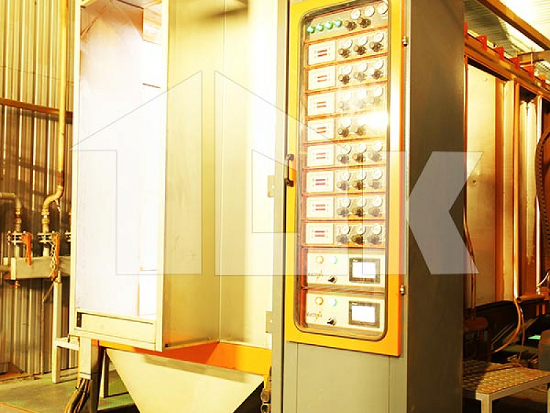 Нанесение полимерного порошкового покрытия на сваренную раму щита осуществляется на автоматизированной линии турецкой компании «Electron Sistem Teknik A.S.», в состав которой включены вертикальный дробемет для подготовки поверхности щита, две откатных автоматических камеры для нанесения порошкового покрытия в электростатическом поле, печь полимеризации и холодильник.