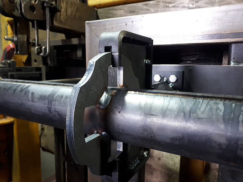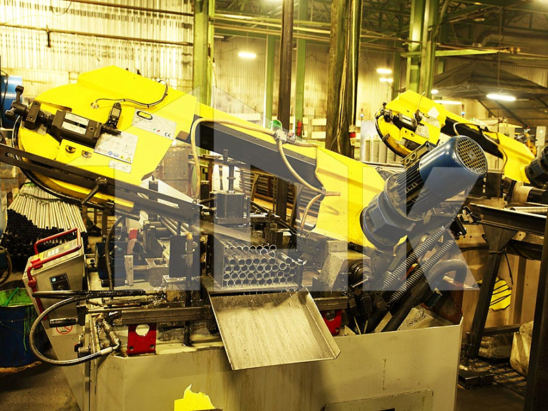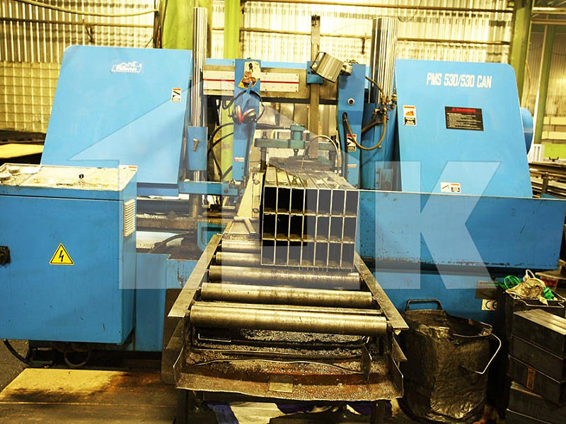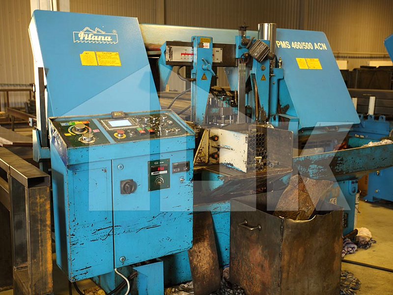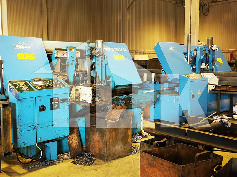 Резка профиля 100х50 (используется для ребер жесткости щита) и трубы (для втулок) производится на автоматических отрезных ленточнопильных агрегатах чешской компании «PILANA», позволяющих в автоматическом режиме осуществлять рез пакета заготовок размером 350х300 мм с точностью ±0,3 мм.