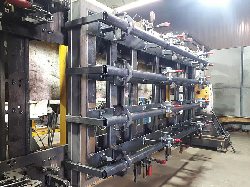 Сварка стальных щитов опалубки осуществляется на роботосварочных комплексах (РСК-1 и РСК-2), имеющих каждый по два пятиосевых манипулятора японской компании «OTC Daihen» и по два сварочных кондуктора с быстрозажимными элементами немецкой компании «AMF». На РСК-1 производится сварка наиболее популярных типоразмеров щитов высотой 3,0 м различной ширины, конструкция РСК-2 позволяет осуществлять сварку в автоматическом режиме щитов размерами от 0,6х0,6 м до 1,2х3,3 м, причем на двух кондукторах может быть задан разный типоразмер щита.